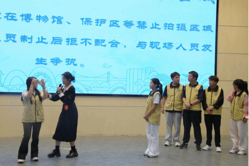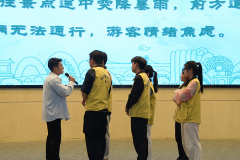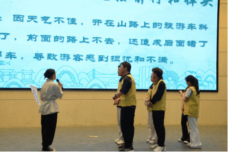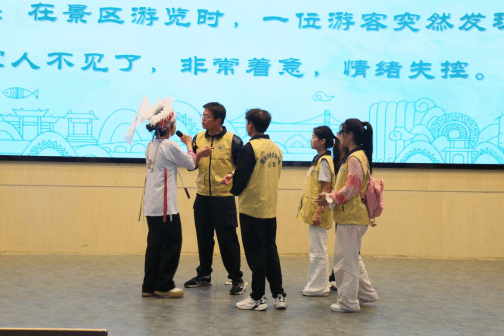 面对“游客财物在景区被盗”“行程中突发暴雨导致道路中断”等模拟场景,助演团队配合选手演绎,以清晰逻辑、流畅表达展现应急处理能力与服务意识,彰显“文旅新青年”的责任担当。