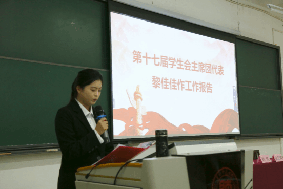 闭幕式由第十七届员工会主席团成员黎佳佳同学主持。会上审议通过员工会、研究生会工作报告的决议(草案),大会提案审查情况报告(草案)。