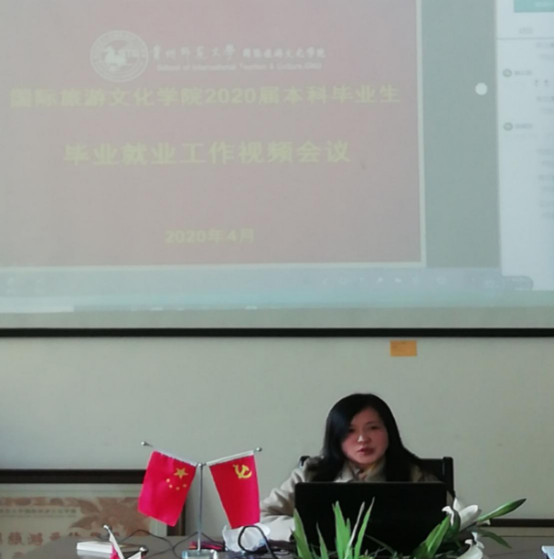 首先, 经理殷红梅 对毕业生的毕业工作进行全面指导。她就毕业论文的撰写及答辩、创新创业素质拓展学分的认定等工作进行了指导,提出了要求。同时,她还就近期中国旅游协会举办的旅游院校毕业生线上招聘等一系列促进就业举措进行了介绍,希望毕业生认清当前的就业形势,积极主动就业。