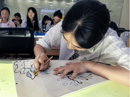 杨晓英老师通过图文解说、现场演示蜡刀技巧、蓝靛浸染等传统技法,员工通过“图纹打稿—画蜡—染色—脱蜡—漂洗”全流程动手实践,在劳动实践中感受贵州传统蜡染手工技艺的艺术魅力。