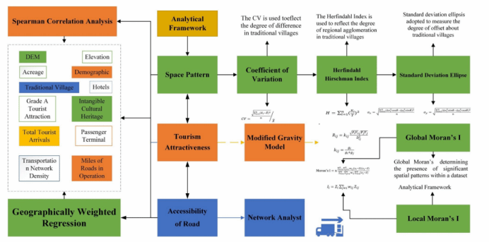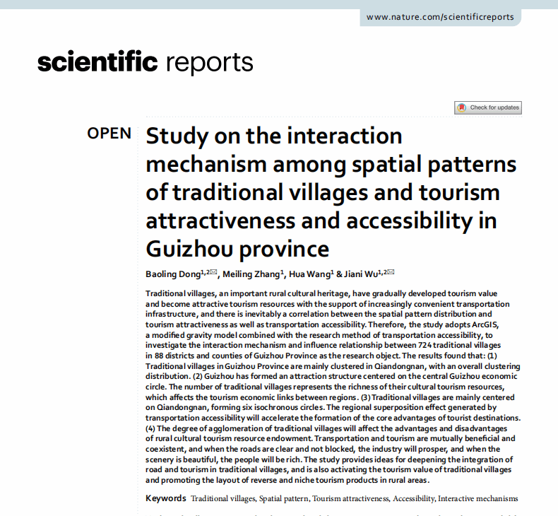 董宝玲博士和吴佳妮教授及团队成员合作发表在《Scientific Reports》上的论文话题为“Study on the interaction mechanism among spatial patterns of traditional villages and tourism attractiveness and accessibility in Guizhou Province”,该论文聚焦我国传统村落的空间分布、旅游吸引力及可达性之间的关系研究。论文以贵州省五个批次共724个传统村落为研究对象,采用ArcGIS空间分析结合旅游吸引力效用模型以及路网可达性分析方法,参考既有关于影响因素的研究,遴选出高程、坡度、耕地面积、人口、传统村落、非遗、A级景区、酒店、旅游总人次、客运站、交通路网密度、公路运营里程10个因素,采用地理加权回归分析以及斯皮尔曼相关分析方法,构建了关于三者之间动力机制的阐释模型。通过定量分析结合空间呈现的方式,立体展现了贵州省传统村落的空间分布特征、旅游吸引力和交通可达性之间的关联关系。深入研究传统村落空间分布格局、旅游吸引力以及交通可达性之间的关联关系与动力作用机制。研究对传统村落活力的焕活、促进传统村落转型发展具备一定的启示,同时也为今后多元化开发文旅产品,丰富乡村旅游产品的供给服务品质等措施的实施提供了思路。