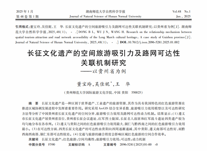 董宝玲博士、吴佳妮教授及团队成员合作发表在《湖南师范大学自然科学学报》上的论文话题为“长征文化遗产的空间旅游吸引力及路网可达性关联机制研究———以贵州省为例”,此论文研究采用ArcGIS结合变异系数、旅游吸引力效用模型以及可达性研究方法等分析了中国贵州省长征文化遗产的空间分异,旅游吸引力效用及路网可达性动力机制。论文研究以贵州省长征文化遗产为研究对象,将其划分为长征会议遗址,红军烈士陵园,长征名人故居和红军战斗遗址四类,通过ArcGIS结合修正的旅游吸引力效用模型,分析了长征文化遗产的空间分布格局及均衡性,测量了贵州省所辖9个市州的旅游吸引力效用,及长征文化遗产目的地路网可达性。论文建立了长征空间资源分布、旅游吸引力与可达性之间的动力模型与机制。相关结论提出了深化长征文化遗产创造性转化和创新性发展的相关措施,同时有助于弥补学术研究领域内对长征文化遗产关注的不足,进一步丰富遗产研究领域的多样性主题。此外,以交通为切入点的红色旅游研究,为今后红色交旅业态融合、红色路衍经济产品创新与产业链延伸提供了一定程度上的启示。