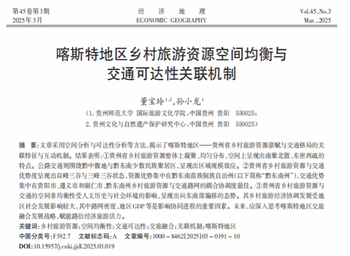 董宝玲博士和孙小龙副教授合作发表在《经济地理》上的论文话题为“喀斯特地区乡村旅游资源空间均衡与交通可达性关联机制”,此论文以典型喀斯特地区——贵州省为例,采用空间分析与可达性分析等方法,探讨了共同富裕目标下乡村旅游资源与道路交通格局的现状,阐释了乡村旅游资源与交通格局的关联影响。论文对贵州省64个全国乡村旅游重点镇(乡)、205个全国乡村旅游重点村、724个中国传统村落、312个中国少数民族特色村寨进行数据收集,将其导入ArcGIS进行可视化分析,并运用空间分析、可达性分析和和地理探测器模型等开展实证研究,建立旅游资源与公路交通网络的耦合协调度模型,利用单因子探测与交互因子探测研究两者耦合协调的驱动因素,从而得出研究结果。研究发现其乡村旅游经济协调发展受地区社会发展影响较大,其中路网密度、地区GDP等是影响协同进程的重要因素。相关结论不仅提出了发挥乡村旅游资源优势、提升路旅融合产品、产业活力等应对措施,还为喀斯特地区贵州省今后立足独特的山地与交通特征,找准交旅融合创新产品的发展定位和目标提供一定参考。