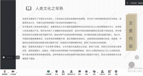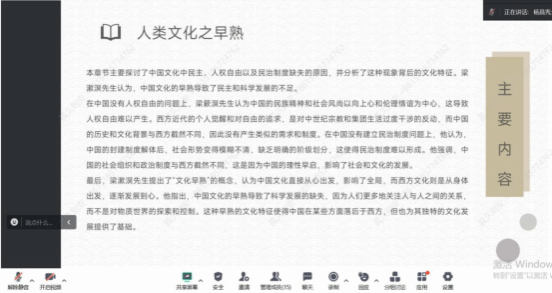 本期读书会导读人就第十二章“人类文化之早熟”进行叙述,从“中国何故无民主”、“人权自由之所以不见”、“民主制度之所以不见”、“人类文化之早熟”等四方面展开。梁漱溟对民主的概念进行分析,提出民主是一种精神,强调中国不是没有民主,只是没有西洋近代国家那样的民主,中国不是缺乏民主,而是缺乏集团生活,缺乏政治和法律。他认为中国文化早熟,从理性出发,由内向外,早熟的表现在中国文化对人际关系和道德伦理重视,强调自我反省和内在修养,文化发展路径独特跳过某些发展阶段,在精神文化上高度发达。
