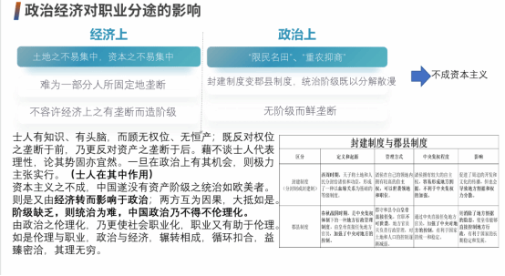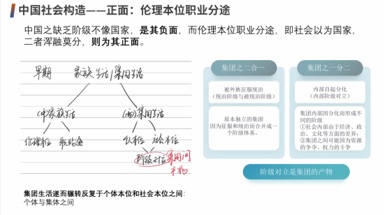 本期导读人将阅读内容、阅读理解、阅读疑问利用PPT的形式进行领读,主要内容是第八章的“阶级对立与职业分途”及第九章“中国是否一国家”进行分享,探讨的主题涉及“什么是阶级”、“中国有没有阶级”、“什么是职业分途”、“国家构成阶级统治”、“中国政治的特殊”、“西洋政治进步之理”等。梁漱溟指出中国在阶级问题上有自己的独特性,非西洋社会存在明显的阶级对立,而是呈现一种职业分途的特点。对阶级的理解需要放在经济政治对立斗争的形势中,经济上的剥削阶级即为政治上的统治阶级,贵贱等级、贫富等级还不足以为阶级。他强调阶级不从理性来,但理性却要从它来,因理性的发展需要在阶级解放的过程中来实现。梁漱溟认为中国没有阶级,并不是说没有剥削和统治支配,而是旧日中国因形势分散、上下流通的特点呈现“职业分途”的现象,社会阶层之间并非严格的阶级对立而是基于职业分工的不同各安其位。梁漱溟认为中国不像一个国家的原因在于对内松弛,政治上的无为而治,对外缺少对抗性,且中国人缺乏国家观念。