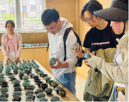 牙舟陶兴于“洪武”,是中国贵州省平塘县牙舟镇的传统手工艺品,于2008年入选国家级非物质文化遗产代表性项目名录。它以其独特的造型、釉色和民族艺术风格,在中国陶瓷界独树一帜。在牙舟陶博物馆,跟随讲解员的脚步,员工们感受着牙舟陶的历史沿革、烧制技艺以及独特魅力。牙舟陶独特的孔雀蓝釉色、冰裂纹、浑然天成的窑变效果以及融合了民族纹样特色的设计,吸引着同学们的目光,同学们也结合自身专业思考如何强化牙舟陶传统技艺与现代市场的古今碰撞,以促进非物质文化遗产的创造性转化和创新性发展。